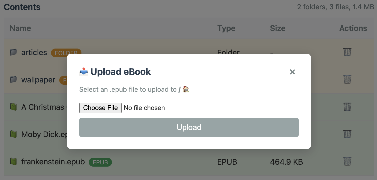 # Web Server Guide This guide explains how to connect your CrossPoint Reader to WiFi and use the built-in web server to upload EPUB files from your computer or phone. ## Overview CrossPoint Reader includes a built-in web server that allows you to: - Upload EPUB files wirelessly from any device on the same WiFi network - Browse and manage files on your device's SD card - Create folders to organize your ebooks - Delete files and folders ## Prerequisites - Your CrossPoint Reader device - A WiFi network - A computer, phone, or tablet connected to the **same WiFi network** --- ## Step 1: Accessing the WiFi Screen 1. From the main menu or file browser, navigate to the **Settings** screen 2. Select the **WiFi** option 3. The device will automatically start scanning for available networks --- ## Step 2: Connecting to WiFi ### Viewing Available Networks Once the scan completes, you'll see a list of available WiFi networks with the following indicators: - **Signal strength bars** (`||||`, `|||`, `||`, `|`) - Shows connection quality - **`*` symbol** - Indicates the network is password-protected (encrypted) - **`+` symbol** - Indicates you have previously saved credentials for this network ### Selecting a Network 1. Use the **Left/Right** (or **Volume Up/Down**) buttons to navigate through the network list 2. Press **Confirm** to select the highlighted network ### Entering Password (for encrypted networks) If the network requires a password: 1. An on-screen keyboard will appear 2. Use the navigation buttons to select characters 3. Press **Confirm** to enter each character 4. When complete, select the **Done** option on the keyboard **Note:** If you've previously connected to this network, the saved password will be used automatically. ### Connection Process The device will display "Connecting..." while establishing the connection. This typically takes 5-10 seconds. ### Saving Credentials If this is a new network, you'll be prompted to save the password: - Select **Yes** to save credentials for automatic connection next time (NOTE: These are stored in plaintext on the device's SD card. Do not use this for sensitive networks.) - Select **No** to connect without saving --- ## Step 3: Connection Success Once connected, the screen will display: - **Network name** (SSID) - **IP Address** (e.g., `192.168.1.102`) - **Web server URL** (e.g., `http://192.168.1.102/`) **Important:** Make note of the IP address - you'll need this to access the web interface from your computer or phone. --- ## Step 4: Accessing the Web Interface ### From a Computer 1. Ensure your computer is connected to the **same WiFi network** as your CrossPoint Reader 2. Open any web browser (Chrome is recommended) 3. Type the IP address shown on your device into the browser's address bar - Example: `http://192.168.1.102/` 4. Press Enter ### From a Phone or Tablet 1. Ensure your phone/tablet is connected to the **same WiFi network** as your CrossPoint Reader 2. Open your mobile browser (Safari, Chrome, etc.) 3. Type the IP address into the address bar - Example: `http://192.168.1.102/` 4. Tap Go --- ## Step 5: Using the Web Interface ### Home Page The home page displays: - Device status and version information - WiFi connection status - Current IP address - Available memory Navigation links: - **Home** - Returns to the status page - **File Manager** - Access file management features ### File Manager Click **File Manager** to access file management features. #### Browsing Files - The file manager displays all files and folders on your SD card - **Folders** are highlighted in yellow with a 📁 icon - **EPUB files** are highlighted in green with a 📗 icon - Click on a folder name to navigate into it - Use the breadcrumb navigation at the top to go back to parent folders #### Uploading EPUB Files 1. Click the **+ Add** button in the top-right corner 2. Select **Upload eBook** from the dropdown menu 3. Click **Choose File** and select an `.epub` file from your device 4. Click **Upload** 5. A progress bar will show the upload status 6. The page will automatically refresh when the upload is complete **Note:** Only `.epub` files are accepted. Other file types will be rejected. #### Creating Folders 1. Click the **+ Add** button in the top-right corner 2. Select **New Folder** from the dropdown menu 3. Enter a folder name (letters, numbers, underscores, and hyphens only) 4. Click **Create Folder** This is useful for organizing your ebooks by genre, author, or series. #### Deleting Files and Folders 1. Click the **🗑️** (trash) icon next to any file or folder 2. Confirm the deletion in the popup dialog 3. Click **Delete** to permanently remove the item **Warning:** Deletion is permanent and cannot be undone! **Note:** Folders must be empty before they can be deleted. --- ## Command Line File Management For power users, you can manage files directly from your terminal using `curl` while the device is in File Upload mode a detailed documentation can be found [here](./webserver-endpoints.md). ## Security Notes - The web server runs on port 80 (standard HTTP) - **No authentication is required** - anyone on the same network can access the interface - The web server is only accessible while the WiFi screen shows "Connected" - The web server automatically stops when you exit the WiFi screen - For security, only use on trusted private networks --- ## Technical Details - **Supported WiFi:** 2.4GHz networks (802.11 b/g/n) - **Web Server Port:** 80 (HTTP) - **Maximum Upload Size:** Limited by available SD card space - **Supported File Format:** `.epub` only - **Browser Compatibility:** All modern browsers (Chrome, Firefox, Safari, Edge) --- ## Tips and Best Practices 1. **Organize with folders** - Create folders before uploading to keep your library organized 2. **Check signal strength** - Stronger signals (`|||` or `||||`) provide faster, more reliable uploads 3. **Upload multiple files** - You can upload files one at a time; the page refreshes after ea