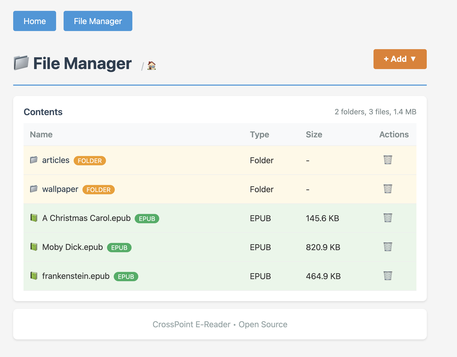 - Upload EPUB files wirelessly from any device on the same WiFi network